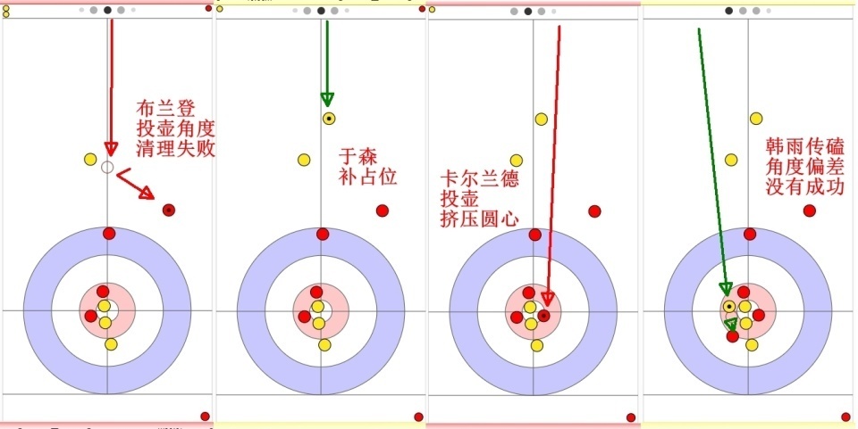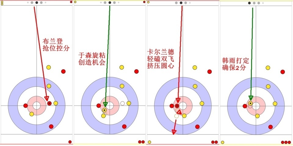 韩雨最后一投试图利用关联双飞红壶,但留下黄壶,可没想到其中一颗红壶留在1近位置...就这样,卡尔兰德最后一投没出手,挪威就有了1分,她也放弃最后一投。
