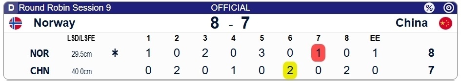 LSD数据上,中国投出了40.0的不错成绩,但挪威组合以29.5更胜一筹,抢到了开局后手权。