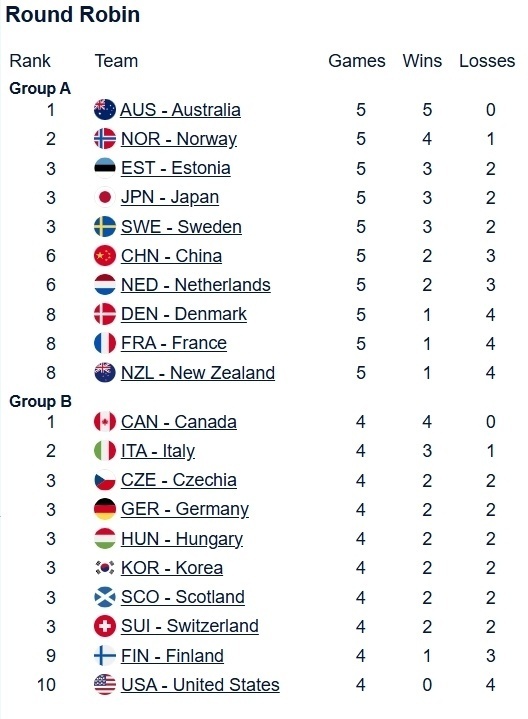 目前中国组合以2胜3负排在小组第六,挪威搭档4胜1负排名第二。