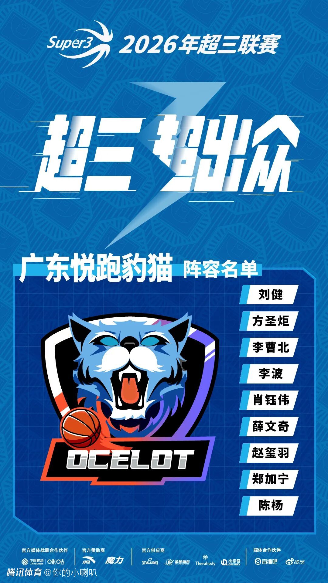 广东悦跑豹猫留住了刘健、李波等5名核心老将。阵容中的新面孔包括回归超三联赛的薛文奇,以及3位首次加入联盟的方圣炬、李曹北、郑加宁。