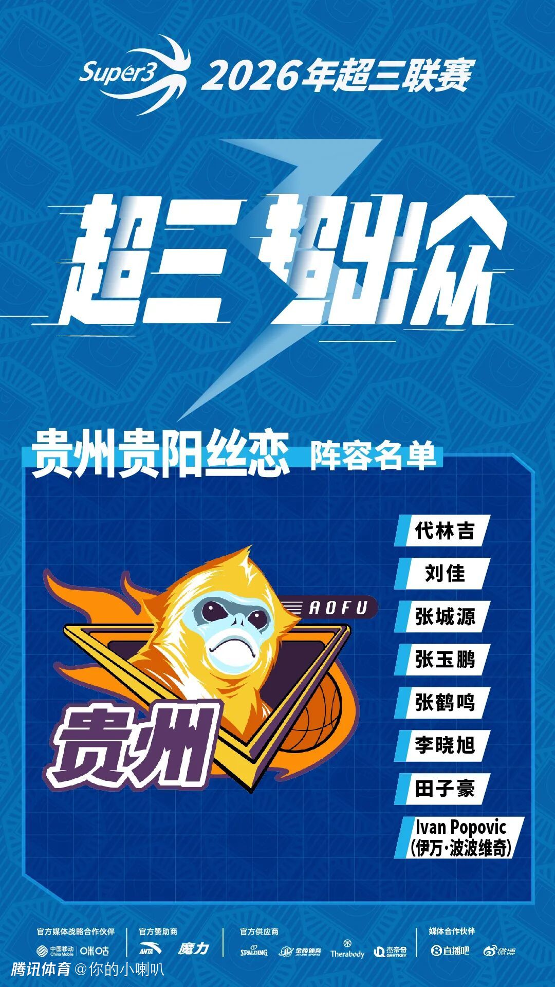 贵州贵阳丝恋阵容几乎完全换血,仅有李晓旭1人留队。新引进了包括外援伊万·波波维奇在内的3名球员,并大胆启用了刘佳、张城源、张玉鹏、田子豪4名新人。