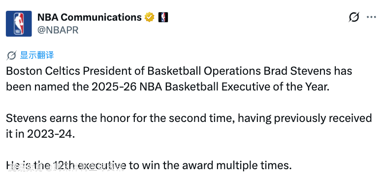 2026-04-29 01:10北京时间4月29日,NBA官方宣布,凯尔特人篮球运营总裁史蒂文斯当选本赛季年度最佳篮球高管,值得一提的是,他在23-24赛季也获得过该奖项。另外,史蒂文斯也成为了NBA历史上第12位多次获得年度最佳高管奖的管理者。