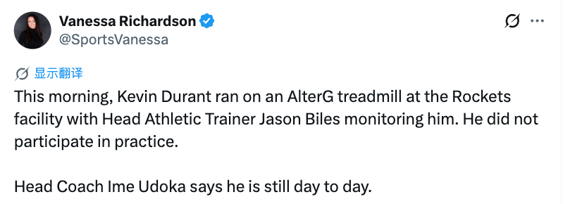 2026-04-29 01:30北京时间4月29日,据火箭队记Vanessa Richardson报道,当地时间今天早上,杜兰特在火箭训练基地的反重力跑步机上进行了跑步训练,球队首席运动训练师杰森-比尔斯全程对他进行监测,但他并未参加球队合练。