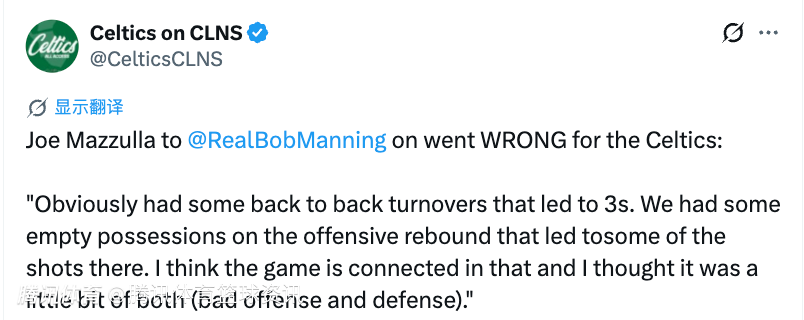 2026-04-29 10:30北京时间4月29日,NBA季后赛,凯尔特人主场以97-113不敌76人,赛后绿军主帅马祖拉接受了媒体的采访。