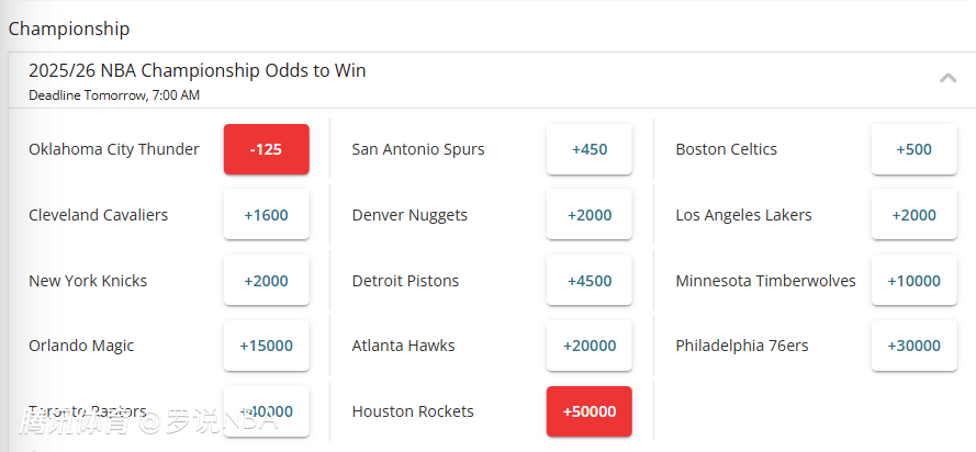 1.雷霆(-125)、2.马刺(+450)、3.凯尔特人(+500)、4.骑士(+1600)、5.湖人、掘金、尼克斯(同为+2000)、8.活塞(+4500)、9.森林狼(+10000)、10.魔术(+15000)、11.老鹰(+20000)、12.76人(+30000)、13.猛龙(+40000)、14.火箭(+50000)。