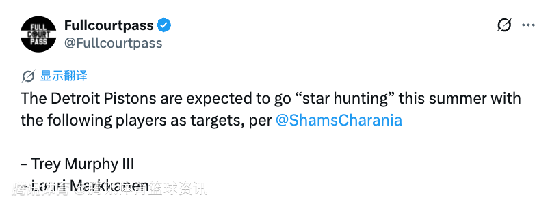 Shams:活塞计划在今夏开启球星狩猎模式 目标包括墨菲马尔卡宁